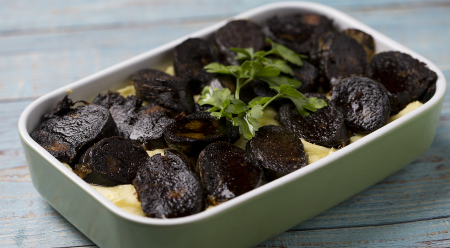 A hurkát elősütjük, majd felkarikázzuk és így is megpirítjuk. A hámozott, pucolt burgonyát puhára főzzük, majd leszűrjük. Kevés vajjal összetörjük és tejjel kikeverve, enyhén sózva egy pürét készítünk belőle. Az almát kimagozzuk, felszeleteljük és vajban megpirítjuk. Kevés kristálycukrot adunk hozzá és némi vízzel félpuhára pároljuk. Egy tűzálló tálat kivajazunk. Alulra tesszük az almakarikákat, rákenjük a burgonyapürét, majd a tetejére halmozzuk a véres hurka karikákat. Meglocsoljuk kevés vajjal és 10-15 perc alatt megsütjük.