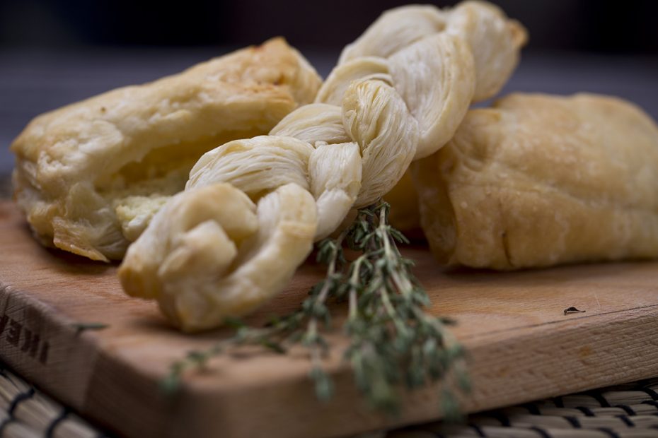 A szétnyomott fokhagymát, sajtot, paprikát összekeverjük egy tálban némi olívaolajjal. A lisztből tésztát gyúrunk, majd batyukat hajtogatunk belőle, és megtöltjük a kecskesajtos töltelékkel. 15-20 perc alatt készre sütjük a sütőben.