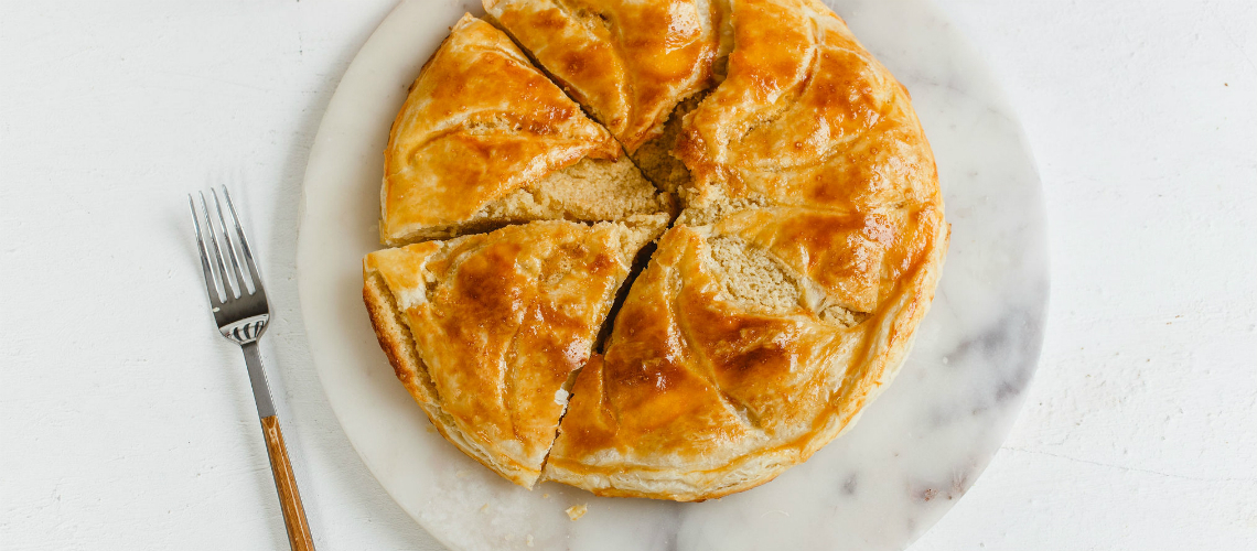 Az egyik leveles tésztát egy piteformába simítjuk. Rákanalazzuk a mandulás masszát, 1 cm peremet hagyva a tészta szélén. Elrejtünk egy egész mandulát a masszában. A tészta peremét hideg vízzel lekenjük, majd ráborítjuk a másik tésztakorongot és a széleket összenyomkodjuk. Egy éles késsel mintát rajzolunk a felső tésztarétegre.