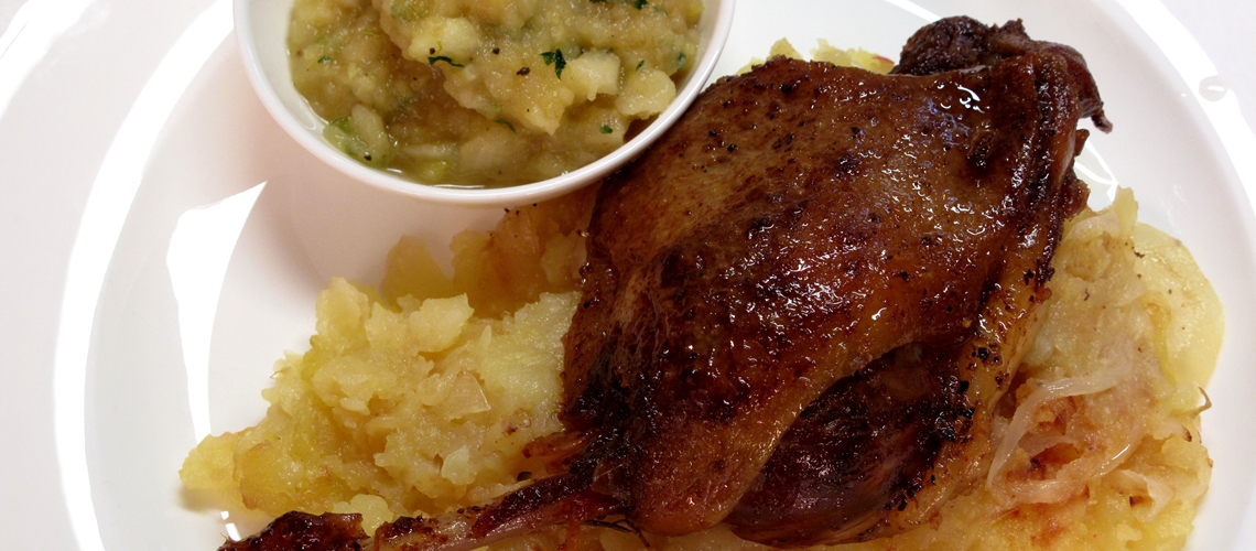 Közben elkészítjük a köretet, a stircelt burgonyát. A 30 dkg, héjában főtt, lehűtött burgonyát durvára reszeljük, az 1 fej vöröshagymát vékony szeletekre vágjuk, majd kevés libazsíron lepirítjuk először a hagymát, majd a burgonyát. Ízlés szerint sózzuk, borsozzuk.