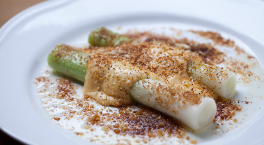 A póréhagymákat tegyük egy sütőtálba. Megszórjuk sóval, borssal és cukorral. Hozzáadjuk a vajat, fokhagymát és kakukkfüvet. 3/4-ig felöntjük vízzel és alufóliával lefedve kb. 30 perc alatt puhára sütjük 180 fokon. Közben az ecetből sóval, borssal, cukorral és olajjal vinaigrette-t keverünk. Vízfürdőben a tojások sárgáját fehéredésig keverjük ecettel, sóval és borssal. Lehúzzuk a tűzről és hozzákeverjük az olvasztott vajat. Hozzáadjuk a citromlevet. A megsütött póréhagymákat adagokra osztjuk és megforgatjuk a vinaigrette-ben. Végül leöntjük a hollandi márátssal, és megszórjuk pirított zsemlemorzsával.
