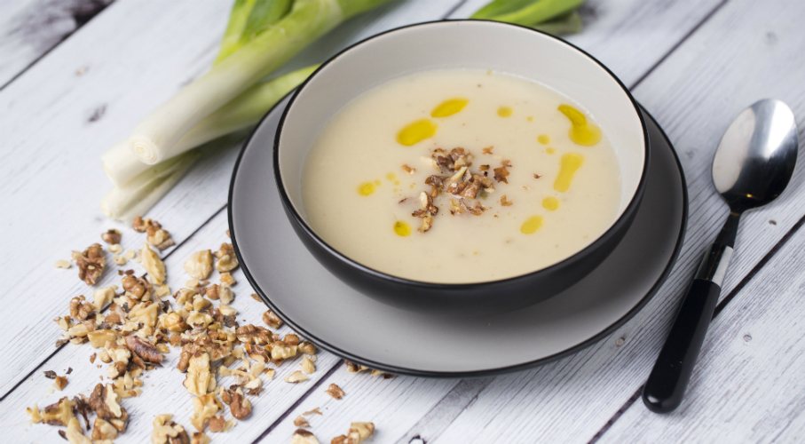 A hűtőben, kamrában található zöldségekből alaplevet készítünk: kevés olajon lepirítjuk a megpucolt zöldségeket, szemes borsot adunk hozzá és felöntjük hideg vízzel. Mikor a zöldségek megpuhultak, az alaplé elkészült. A felaprított hagymát üvegesre pároljuk a vajon. A csicsókát meghámozzuk (citromos vízbe tesszük, mert nagyon hamar megbarnul) és felkockázzuk. A hagymához adjuk a csicsókát és a felkockázott körtét. Szerecsendióval és szárított kakukkfűvel fűszerezzük.Felöntjük az alaplével, sózzuk, borsozzuk. 20-25 percig főzzük, majd botmixerrel pürésítjük. Végül, adunk hozzá egy evőkanálnyi vajat és egy kevés tejszínt. A diót megpirítjuk, majd apró darabokra vágjuk, tálaláskor a levesre szórjuk.