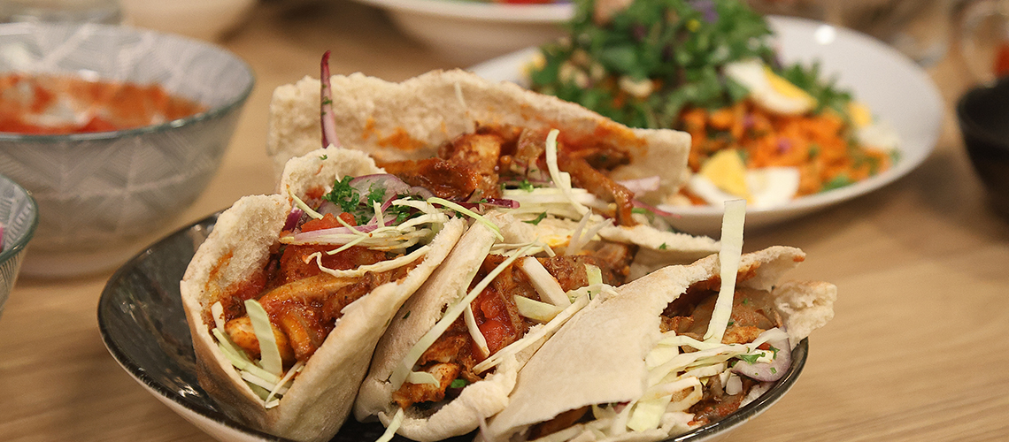 A gombát vékony szeletekre vágjuk és befűszerezzük, majd összeforgatjuk az olajjal, és szétterítjük egy rétegben egy tepsin. 250 fokra előmelegített sütőbe tesszük és kb. 25 percig sütjük, hogy ropogós legyen, de ne száradjon ki. Közben bepácoljuk a hagymát: nagyon vékonyra szeleteljük, és ráöntjük az ecetet. Összeforgatjuk a finomra aprított petrezselyemmel, és állni hagyjuk. A szószhoz a paradicsomkonzervet egy kisebb lábasba tesszük, és sűrűre főzzük. Közben hozzáadjuk a harisszát és egy kevés cukrot, majd a végén citromlével, sóval, borssal ízesítjük. A káposztát vékonyra szeleteljük, és enyhén sózzuk. A pitát kettévágjuk, és kissé megpirítjuk. Tálaláskor erre halmozzuk a káposztát, a fűszeres, sült gombát, a chiliszószt és a savanyított hagymát.