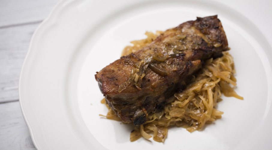 Az oldalast alaposan bedörzsöljük sóval, borssal, zúzott fokhagymával, majd kevés szeletelt vöröshagymával és zsírral együtt sütőtepsibe tesszük, kevés vizet öntünk rá, letakarjuk és 140 fokon 3 órán keresztül sütjük. A sütés vége előtt levesszük a fóliát a húsról és 190 fokos sütőben készre pirítjuk. Kevés zsírban kristálycukrot karamellizálunk. Beleszórjuk az egész köményt és rátesszük a szeletelt vöröshagymát, valamint a vékony csíkra vágott édeskáposztát. Sózzuk, borsozzuk, kevés ecetet adunk hozzá, némi vízzel felöntjük és fedő alatt puhára pároljuk.