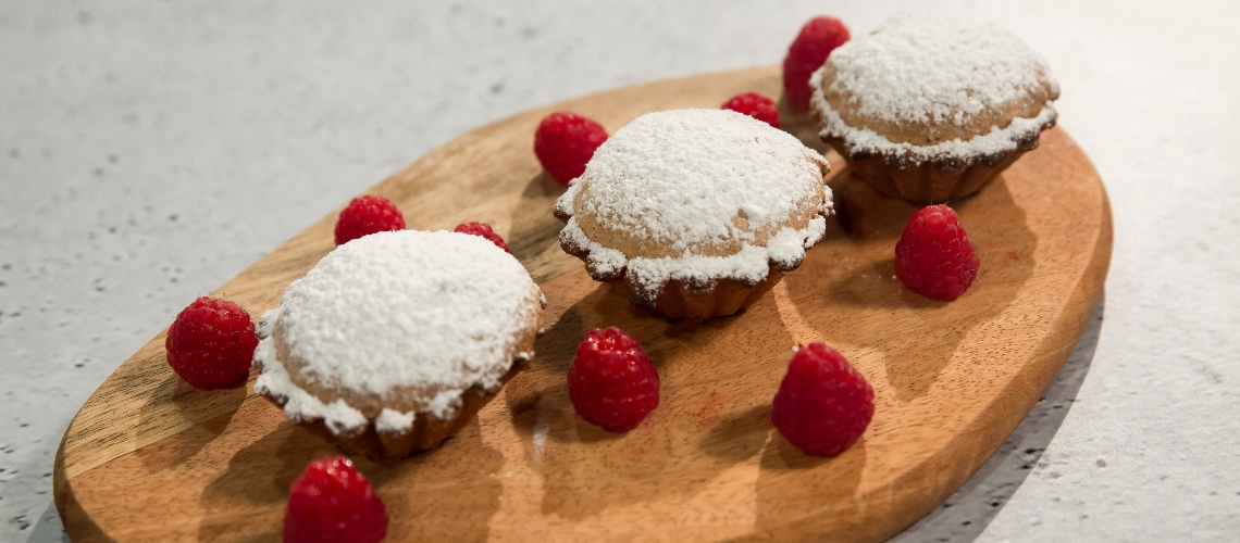 A kosárkákat kivajazzuk. Kis pihentetés után a tésztát kinyújtjuk, majd egy a kosárkákkal azonos méretű kiszúróval köröket vágunk ki belőle. A kivajazott formákba helyezzük, majd finoman a hüvelykujjunkkal elegyengetjük.