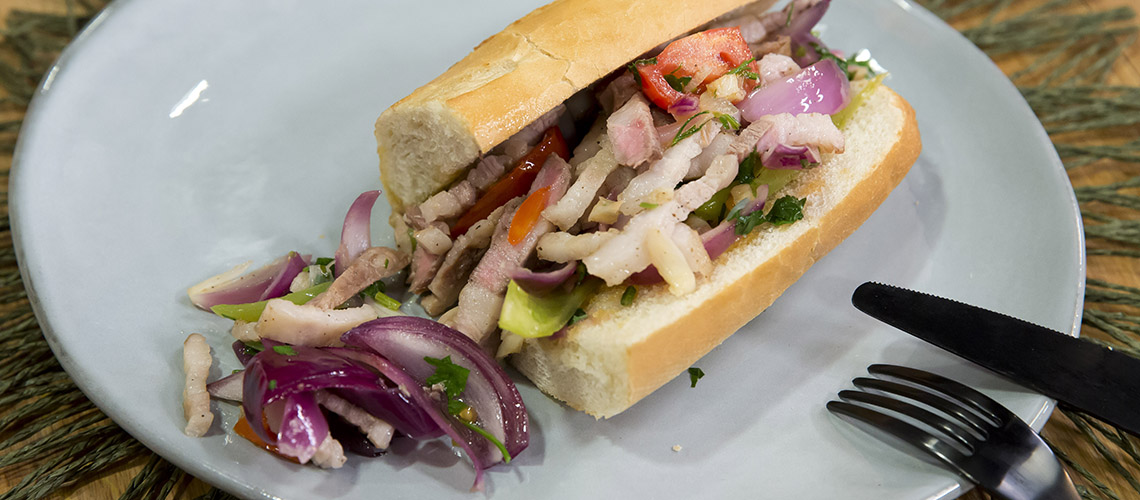 A salátához a mangalica császárhúst vékony ceruzányi csíkokra, a szendvicshez szeletekre vágjuk, és zsírjára sütjük. Nagy lángon, gyors hőkezeléssel.