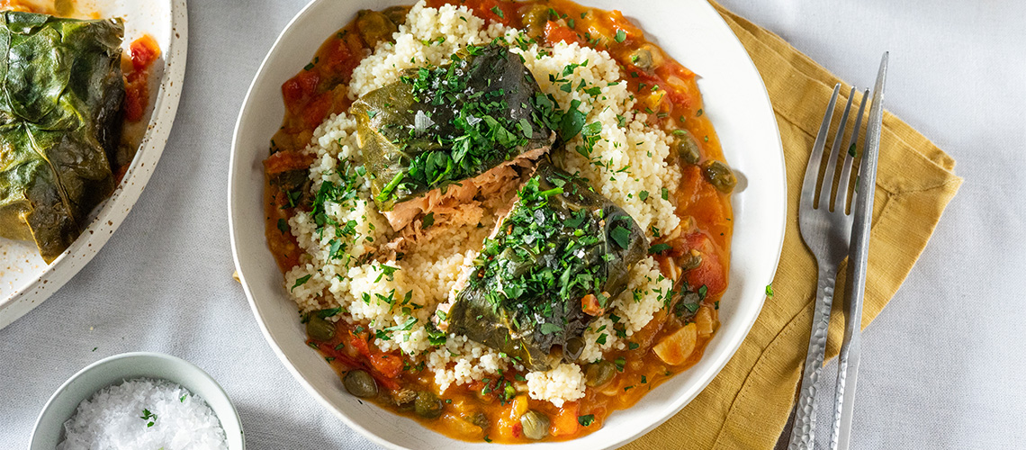 A kuszkuszhoz közepes lábosban felforraljuk a vizet a citromlével, olívaolajjal és kevés sóval. Elzárjuk a lángot, a lábosba szórjuk a kuszkuszt, megkeverjük és lefedjük. 5 perc múlva villával szétpergetjük az átgőzölt szemeket, 1 evőkanál vajat a kuszkuszhoz keverünk.