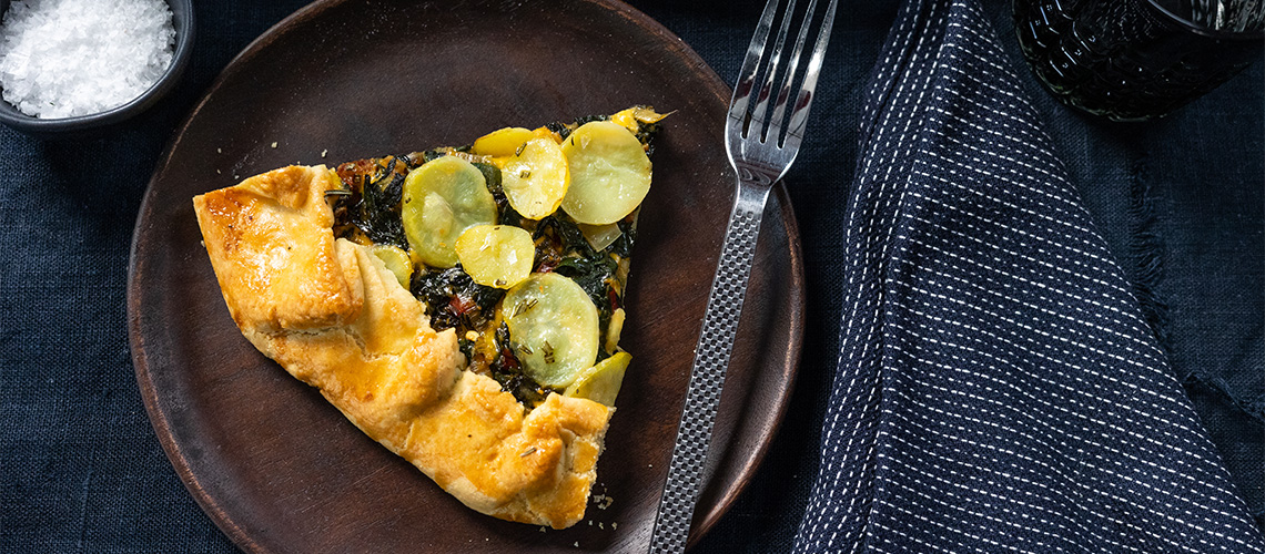 Sütőpapíron 3 mm vastagságúra nyújtjuk a tésztát, ráborítjuk a mángoldos tölteléket és elhelyezzük rajta a felszeletelt újburgonyát. Körben 3-4 centis peremet hagyunk,