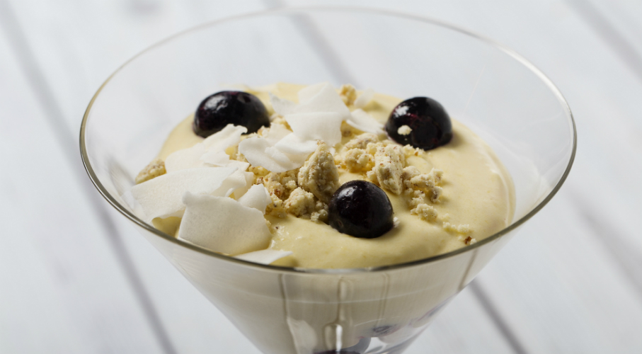 A mangót nagyobb darabokra vágjuk és turmixgépbe tesszük. Hozzáadjuk a cukrot, lime levét és egy csipet sót, összeturmixoljuk. Hozzáöntjük a vaníliakivonatot. A habtejszínt lágy habbá verjük, hozzáadjuk a mangópürét és tovább habosítjuk. Ha kell cukorral vagy citromlével utánaízesítjük. Poharakba szedjük, belekeverjük az áfonyát, azonnal vagy kissé lehűtve tálaljuk.