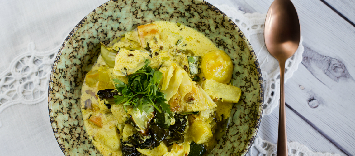 A sütőt előmelegítjük 220C fokra (alul/felül). A burgonyát meghámozzuk, a kisebb szemeket egyben hagyjuk, a nagyobbakat félbevágjuk. Összeforgatjuk az olívaolajjal, sózzuk, majd egy nagy, sütőpapírral lefedett tepsi egyik felér szórjuk. 15 percig sütjük. Közben meghámozzuk és felkockázzuk a karalábét, félhold darabokra szeleteljük a cukkinit, és nagyobb darabokra vágjuk a karfiol levelét, és bármilyen más megmaradt zöldséget. Ezeket is összeforgatjuk olívaolajjal. Amikor letelt a 15 perc, és a burgonya félig megsült, kivesszük a tepsit (kesztyűvel, mert forró!), és a másik felére szórjuk a többi zöldséget. Visszatesszük, és 20 percig sütjük. Ezalatt minden megpuhul, és megpirul (a levélfélék, pl. karfiol levele, vagy káposzta enyhén meg is éghet). Miközben sülnek a zöldségek, elkészítjük a fűszeres mártást: egy lábasban felolvasztjuk a vajat, hozzáadjuk az olajat. Beletesszük a finomra aprított hagymát, fokhagymát és gyömbért, üvegesre dinszteljük. Hozzáadjuk a fűszereket, pár másodpercig pirítjuk, majd felöntjük 4 dl vízzel. Beletesszük a napraforgómagot, sózzuk, és fedő alatt 15 percig főzzük. Ekkor botmixerrel kissé pépesítjük (a hagymától és a szotyitól besűrűsödik). Hozzáöntjük a tejszínt, pár percig erős lángon fözzük. Ekkor hozzáadjuk az összes megsütött zöldséget, valamint esetleg 10-15 dkg fagyasztott zöldborsót. Óvatosan átkeverjük, és levesszük a tűzről. A joghurtot simára keverjük, hozzáadunk néhány evőkanállal a forró szószból, simára keverjük, majd visszaöntjük a raguba, és elkeverjük. A joghurttal már semmiképpen nem főzzük tovább, mert akkor kicsapódna. Tálaláskor vékonyra szeletelt újhagymát és ha van, friss koriandert szórunk, adhatunk hozzá extra joghurtot. Ha csak felnőtteknek készül, akkor eleve főzhetjük csípősre, ha gyerekek is esznek belőle, akkor chili nélkül főzzük, tálaláskor viszont adunk hozzá chiliszószt, vagy chilit.