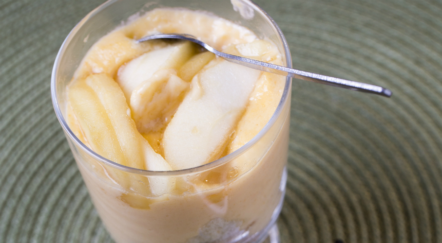 A sütőt 175 fokra előmelegítjük. A tojásokat szétválasztjuk. A tojássárgát a cukorral, vaníliával fehéredésig keverjük a robotgép habverő fejével. Beledolgozzuk a mandulalisztet és a sütőport. A tojásfehérjét csipet sóval kemény habbá verjük, majd óvatosan a masszába forgatjuk. Egy 20×30 cm-es tepsit sütőpapírral kibélelünk és beleöntjük a tésztát. Az előmelegített sütőbe tesszük és addig sütjük (közben a sütő ajtaját nem nyitjuk ki!), amíg a piskóta teteje aranybarna nem lesz (kb. 30 perc). A tepsiből kiborítjuk és hagyjuk kihűlni. A tejszínt és a tejet kis lábosban forráspontig melegítjük. A tojássárgáját a cukorral fehéredésig keverjük, majd kanalanként hozzáadjuk a meleg tejes keveréket. Belemorzsoljuk a marcipánt, visszatesszük a tűzhelyre és folyamatos kevergetés mellett közepesen alacsony lángon sűrűre főzzük. Az almákat meghámozzuk, magházukat kivágjuk és kidobjuk, a gyümölcsöt vékony szeletekre vágjuk. Egy serpenyőben felolvasztjuk a vajat, rádobjuk az almaszeleteket s közepesen erős láng felett lepirítjuk őket. Amikor összeestek, megszórjuk barnacukorral és aranybarnára pirítjuk. Összeállítjuk a desszertet: a piskótát összetépkedjük, lerétegezzük a sült almával és a sodóval, a tetejére sodót és száraz serpenyőben pirított mandulaszeleteket teszünk.