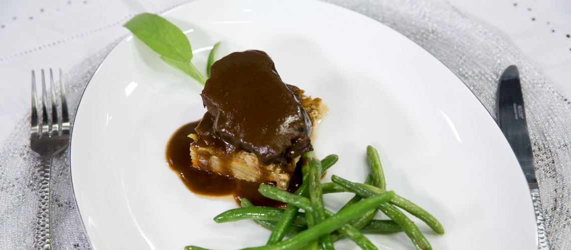 Vajazott tepsibe terítem, majd felöntöm felvert tojás, tejszín és tej keverékével. 160 fokos sütőben készre sütöm. Tálaláskor a formára vágott sült zöldségekre teszem a szeletelt marhahúst. Leöntöm a mártással és vajban pirított ceruzababot adok mellé.