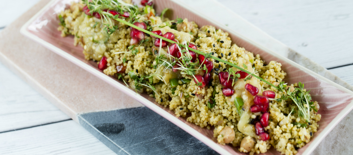 Süssük meg a padlizsánt. Melegítsük fel az alaplevet, pirítsuk meg a mogyoróhagymát, adjunk hozzá fűszereket, a csicseriborsót, a kuszkuszt, majd öntsük rá a forró alaplevet és hagyjuk, hogy megszívja magát.