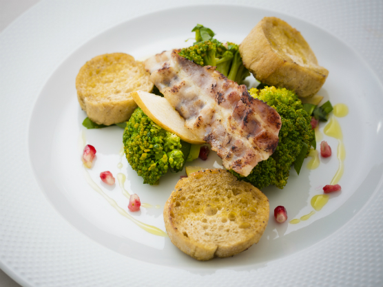 Egy gránátalma magjait és levét keverőtálba csavarjuk, 1 evőkanál mézzel, 1 citrom levével, 2 dl olívaolajjal, sóval, borssal öntetet keverünk belőle. A rózsákra szedett brokkolit leforrázzuk, összeforgatjuk a szeletelt körtével és a darabolt medvehagymával. Egy serpenyőben megsütjük a bacont, és a baguette szeleteket is egy kis olívaolajon. Tálalás előtt megolcsoljuk az öntettel, és friss kevert salátával kínáljuk.
