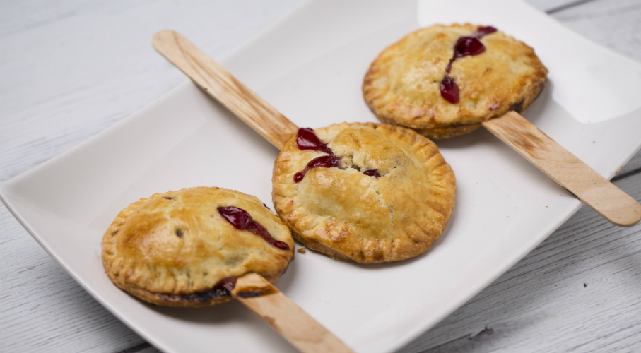 A töltelékhez egy kis cukorral, citromhéjjal megfőzzük a magozott, félbe vágott meggyet, majd a végén egy kis étkezési keményítővel besűrítjük. A pitetésztát kinyújtjuk, kis köröket (6-8 cm átmérő) vagy szívecskéket vágunk belőle. Egy tésztát a tepsire helyezünk, rátesszük a meggyes tölteléket és egy kis reszelt marcipánt. A tészta szélét tojással megkenjük, ráteszünk egy újabb tésztalapot, és villával körbenyomkodjuk a széleit. Vághatunk rá mintát, kis lyukakat. 190 fokos sütőben 20-25 perc alatt megsütjük.