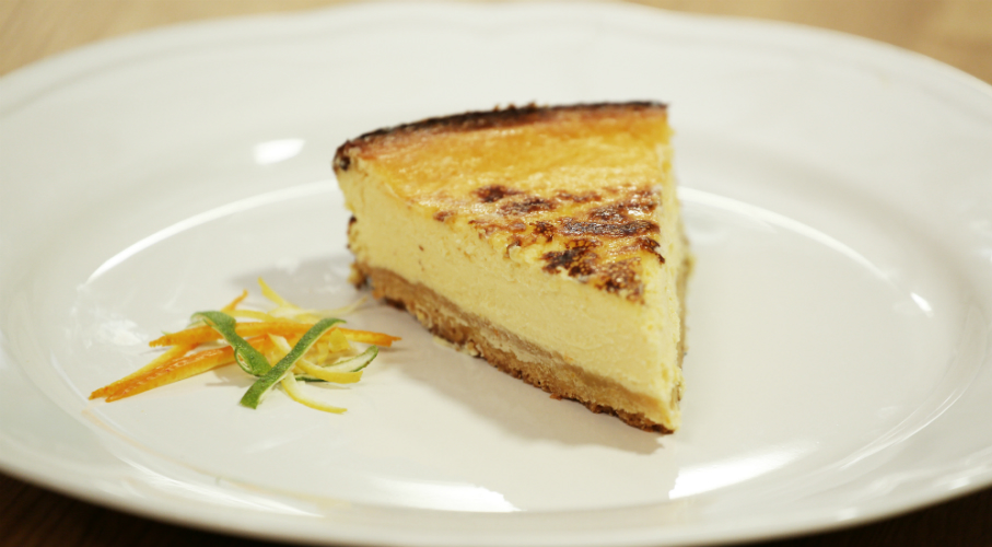 Egy tálban habverővel felverjük a tojást és a cukrot, hozzáadjuk a krémsajtot, a ricotta sajtot, a habtejszínt, az aromát és a reszelt narancshéjat, és majdnem habosra keverjük. A tortaalaphoz a hozzávalókat összemorzsoljuk, cipót formálunk belőle, beletekerjük fóliába, és 30 percre a hűtőbe tesszük. A tésztát kinyújtjuk és egy sütőpapírral kibélelt csatos tortaformába belerakjuk. Ráöntjük a krémet, és előmelegített sütőben, 180 fokon 30-40 percig sütjük.