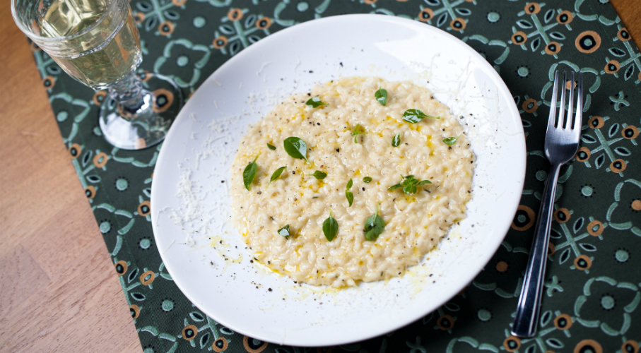 A megtisztított zöldségeket félbe vágjuk, majd serpenyőben szárazon világosbarnára pirítjuk. Ezután felöntjük forró vízzel, és sóval ízesítjük. Lassan legalább 40 percig főzzük. A vaj egy részén megdinszteljük a salotta hagymát. Rászórjuk a rizst, és üvegesre pirítjuk. Felöntjük borral, és elpárologtatjuk, majd folyamatos keverés közben merőkanállal hozzáadjuk a forró alaplevet. Folyamatosan keverjük, míg elpárolog. Addig folytatjuk, míg a rizs fogkemény lesz. Végül összekeverjük parmezánnal és jéghideg kockára vágott vajjal.