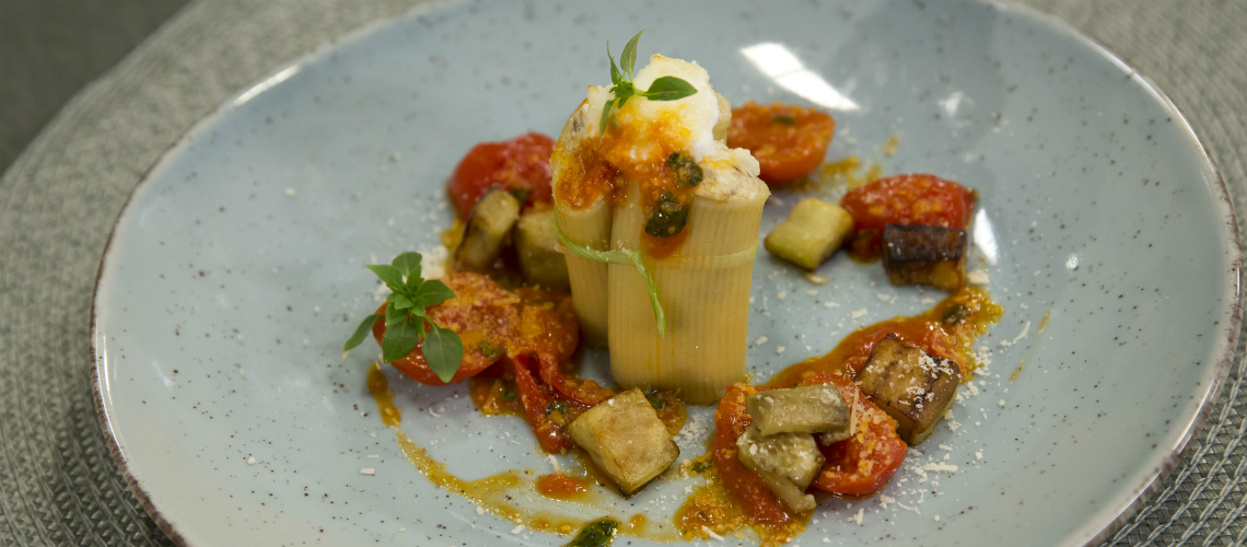 A padlizsánt süssük meg sütőben, majd hámozzuk meg és csepegtessük le. A póréhagymát vékony szeletekre vágjuk úgy, hogy cérnaként használhassuk a későbbiek során. Paradicsommártást készítünk: egy serpenyőben olívaolajon megfuttatjuk a bazsalikomot és fokhagymát, majd ezeket kivesszük a serpenyőből és beletesszük a koktélparadicsomot. Elkészítjük a tölteléket: az ordát bazsalikommal ízesítjük, majd beletesszük a sült padlizsánt és a reszelt parmezánt. Egy serpenyőben padlizsánkockákat pirítunk. Sós vízben kifőzzük a paccheri tésztát, kis olajjal lehűtjük, és megtöltjük a hengereket a padlizsános töltelékkel, majd 5 percig sütjük sütőben. A töltött pacchierit paradicsommártással és pirított padlizsánkockákkal tálaljuk.