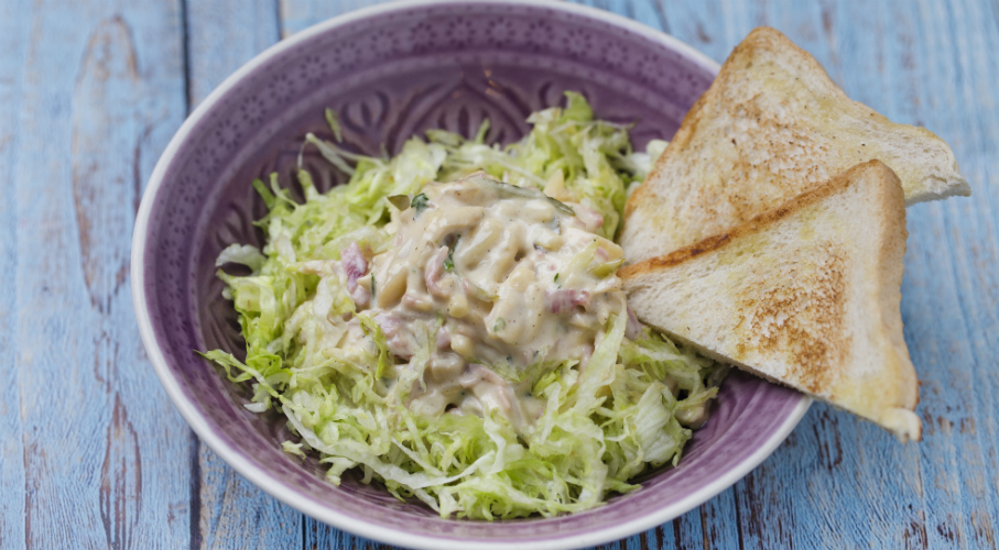 A tojás sárgájához kevés mustár adunk, majd az olajat vékony sugárban hozzácsurgatva majonézt keverünk. Sóval és citromlével ízesítjük, borsozzuk, hozzákeverünk tejfölt, még egy kis mustárt és porcukrot. A húsokat, a főtt burgonyát, az uborkát, almát vékony csíkokra vágjuk. Alaposan összeforgatjuk a mártással és friss tárkonylevéllel fűszerezzük. Pirítóssal és csíkokra vágott jégsalátával tálaljuk.
