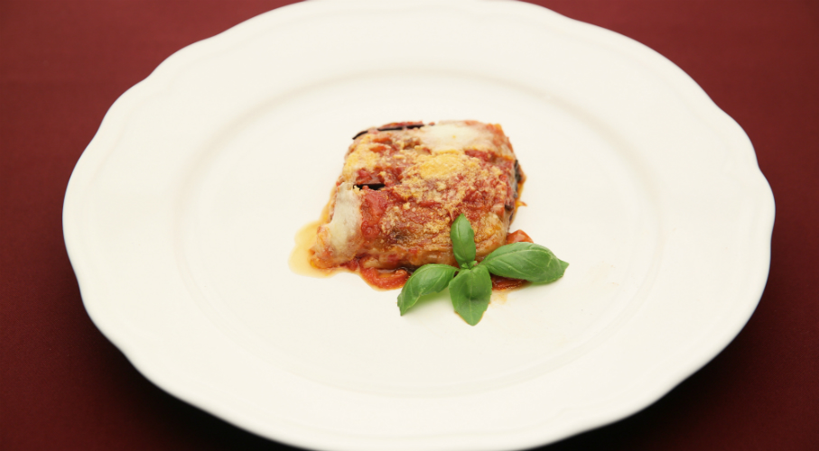 Az apróra darabolt hagymát megdinszteljük az olívaolajon. Beledobunk egy gerezd fokhagymát, pár percet várunk, hogy megváltozzon a fokhagyma színe, aztán kivesszük. Hozzáadjuk a paradicsomot, a bazsalikomot, és ízlés szerint sózzuk. Kb. 25 percig főzzük, szükség esetén kevés meleg vizet öntünk rá. 1/2 ujjnyi vastagra felszeleteljük a padlizsánt. Sózzuk, és pár percre félretesszük, hogy a kesernyés leve kioldódjon. Leöblítjük, majd leszárítjuk a szeleteket papírtörlőn. A napraforgó olajban megsütjük a padlizsánszeleteket. Papírtörlőre kiszedjük, hogy felszívja a fölösleges olajat. Egy kisebb tepsiben az alábbiak szerint rétegezzük. Az alsó sort a paradicsomszósszal kezdjük, ráhelyezünk egy sor sült padlizsánt, újból egy sor paradicsomszósz, a tetejére reszelt parmezán- és mozzarella sajtot szórunk, utána egy újabb sült padlizsán sor, és ezt háromszor megismételjük. A tetejét a paradicsomszósszal zárjuk, rászórjuk a reszelt parmezán sajtot (a mozzarellát kihagyjuk, mert megégne a sütőben). 180 fokra előmelegítette sütőbe rakjuk, 5 perc múlva levesszük 160 fokra, és legalább 25 percig sütjük. Melegen tálaljuk.