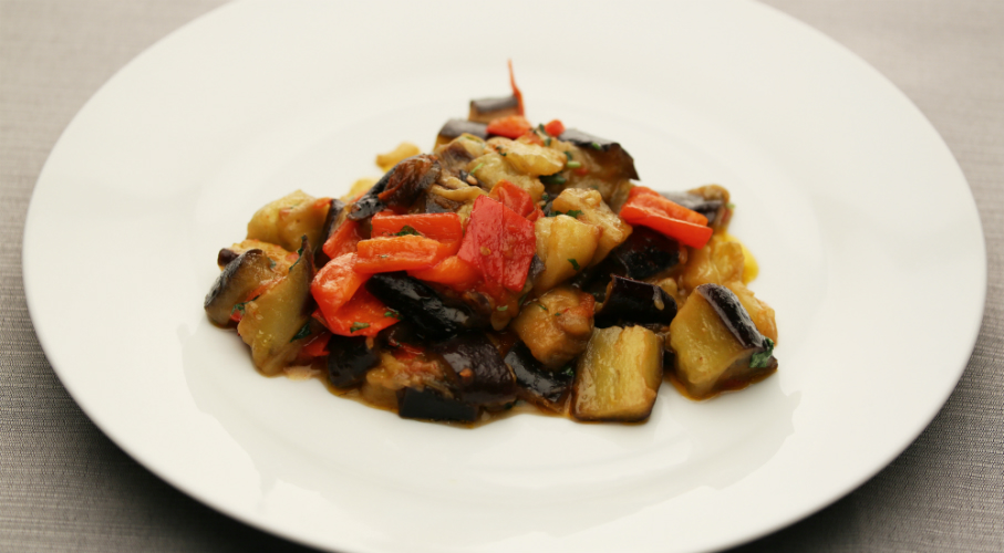 Kockára daraboljuk a padlizsánt, a paradicsomot és a paprikát. Egy serpenyőben olíva olajban, közepes tűznél megpirítjuk a padlizsánt a fokhagymával és bazsalikommal együtt. Amikor barnulni kezd, hozzáadjuk a paprikát és a paradicsomot, lefedjük és lassú tűznél tovább készítjük. Csak a legvégén sózzuk és borsozzuk, ízlés szerint, hogy ne engedjen túl sok levet a padlizsán. Melegen tálaljuk.