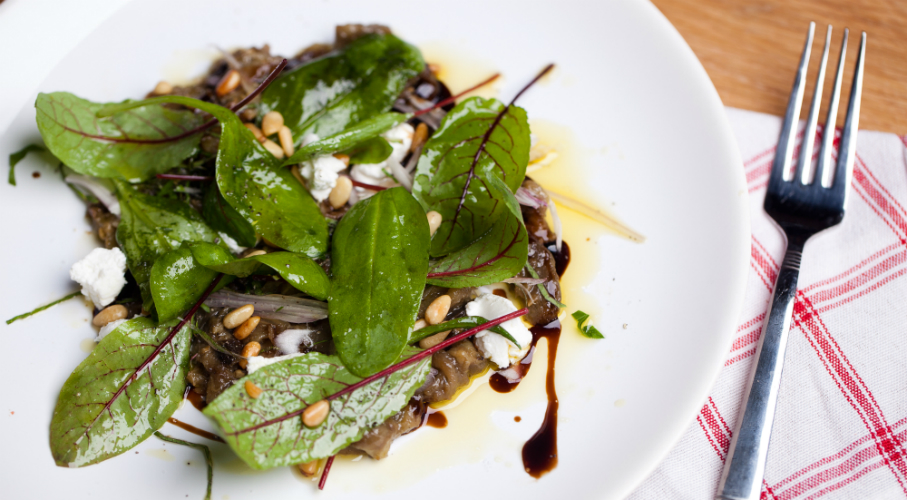 Az egész padlizsánokat a gáz felett megpirítjuk, majd a 180 fokos sütőbe tesszük. A salottahagymát apróra vágjuk és összekeverjük a zöldfűszerekkel. A megsült padlizsánok szárát eltávolítjuk és hosszú szálakra tépkedjük. Egy tányérra tesszük, megszórjuk sóval, borssal és meglocsoljuk ecettel. Megszórjuk a zöldfűszerekkel és a fenyőmaggal. A kecskesajtot kanállal darabokra tördeljük és a padlizsánra szórjuk. Végül meglocsoljuk olívaolajjal.