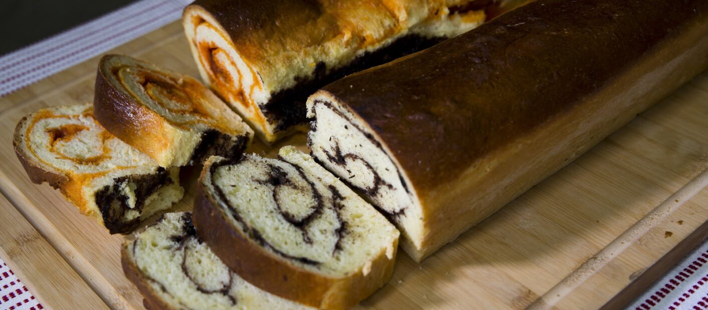 A töltelék hozzávalóit alaposan összekeverjük. A megkelt tésztát 2 gombócra osztjuk, majd hosszúkás téglalapokat nyújtunk belőlük a munkalapon. Egyet megkenünk a kakaós töltelékkel és feltekerjük. A másik kinyújtott tésztát a paprikás töltelékkel kenjük meg, és szintén feltekerjük. A kalácsok végét összecsípjük, majd a kivajazott tepsibe tesszük. Kevés tejbe teszünk 2 tk cukrot, elkeverjük, majd a kalácsokat megkenjük vele. Hagyjuk még kelni kb. 1 órát, majd 200°-ra előmelegített sütőben pirosra sütjük őket.