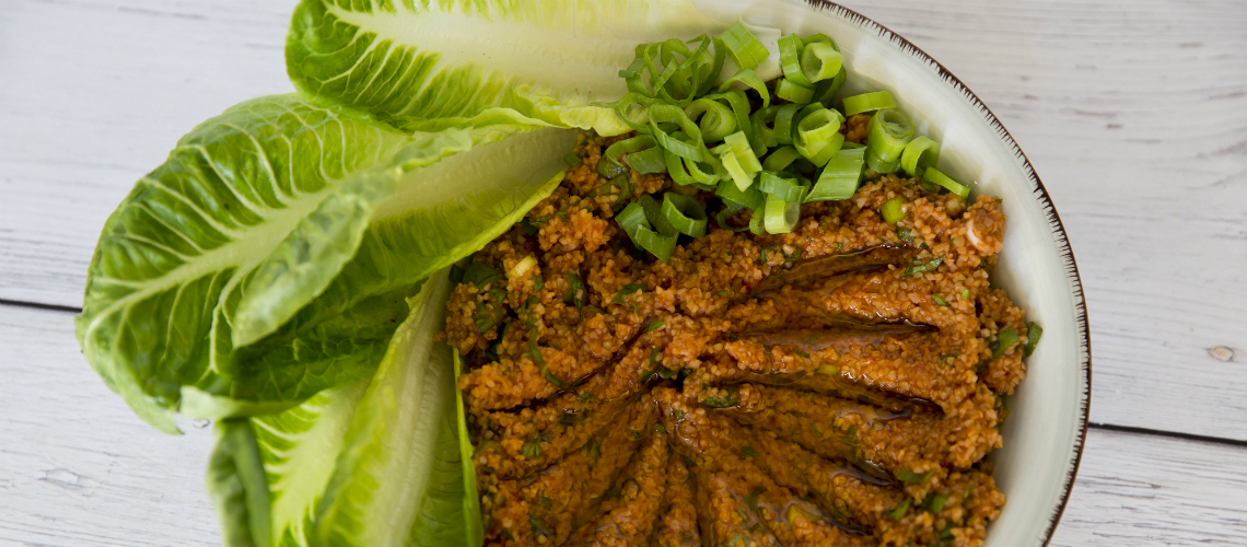 A bulgurt egy tálba teszem és leöntöm a felforralt vízzel. Lefedem és 20 percig hagyom állni, amíg megpuhul. Közben vékony karikákra vágom az újhagymát, zöldjével együtt. Felaprítom a petrezselymet és mentát, kifacsarom a citrom levét. A megpuhult bulgur-hoz hozzákeverem a paradicsompürét, a citromlevet, olívaolajat, chilipaprikát (ha nincs friss, szárított, vagy cayenne bors is használható), átkeverem, hozzáadom az újhagymát és a zöldfűszereket. Ízlés szerint sózom, borsozom. Néhány óra a hűtőben nem árt neki. Hagyományosan salátalevelekben tálalják.