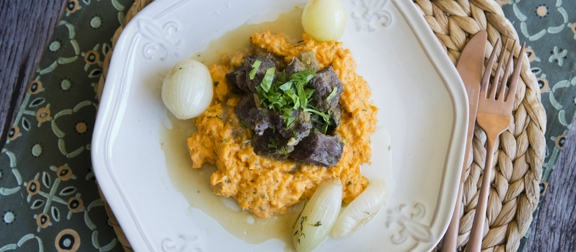 Az édesburgonyát megtisztítjuk, tepsibe tesszük, fűszerezzük és 180 fokos sütőben megsütjük. Gyorsan megpirítjuk meg a húst a zöldségekel, fűszernövényekkel. Felöntjük borral, elforraljuk, majd hozzáadjuk az alaplevet és sütőben puhára sütjük, majd a szaftot mixerre egyneműsítjük.