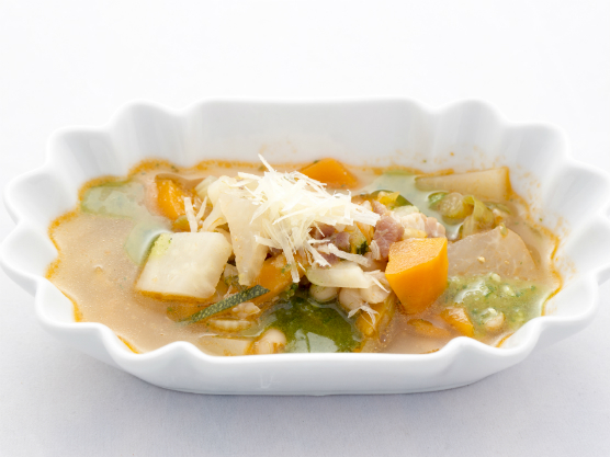 10 dkg kis darabokra vágott húsos szalonnát kevés olívaolajon megpirítunk, majd ráteszünk 3 szál szeletelt újhagymát, 2 szál darabokra vágott sárgarépát és egy szintén darabokra vágott karalábét és zellergumót. Néhány percig együtt pirítjuk, felöntjük 1 dl paradicsomlével, fél liter alaplével és kis vízzel. Sózzuk, borsozzuk. A pesztóhoz 2 csokor friss bazsalikomot, 4-5 gerezd fokhagymával, 5 dkg parmezánnal, 1 marék fenyőmaggal, és fél dl olívaolajjal összeturmixolunk. Amikor a gyökérzöldségek félig megpuhultak, hozzáadunk 1 csíkokra vágott cukkinit és egy negyed szeletelt kelkáposztát. Ha kell, még vizet adunk hozzá, majd mikor minden zöldség megfőtt, egy konzerv leszűrt fehérbabot adunk hozzá. Tálaláskor a pesztóval locsoljuk.