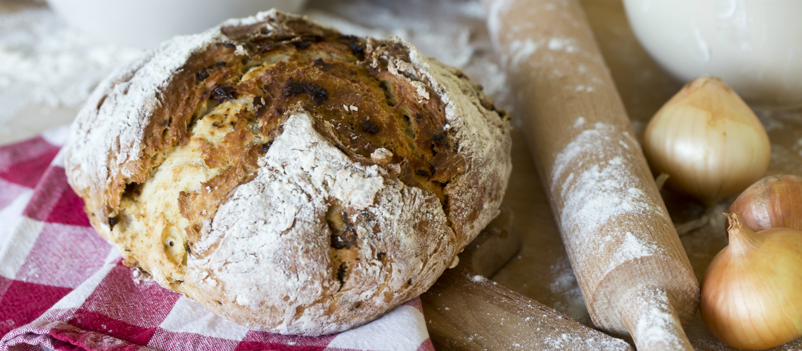 A lisztbe keverjük a sót, cukrot és a szódabikarbónát. A liszt közepébe mélyedést készítünk és ide öntjük az írót. Kezünkkel elkezdjük összedolgozni a tésztát, dagasztani nem kell. Amikor kezd összeállni belekeverjük a hagymát is. Ha összeállt kis labdvá, sütőpapíros tepsire tesszük, kicsit belisztezzük és késsel jó nagy mélyedést vágunk bele (kereszt alakban). 2oo fokos sütőben (előmelegítés fontos) sütjük, 35-4o perc alatt szép színe lesz.
