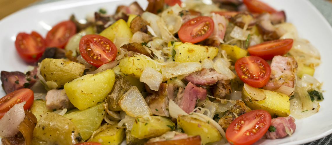 A formázott, előkészített sertés császáthúst, a belső, húsos oldalán sóval, pácsóval, borssal, vágott fokhagymával, frissen vágott petrezselyemzölddel és rozmaringgal ízesítem. Bőrös oldalával kifelé feltekerem és azért, hogy beférjen a háztartási sütőbe, félbevágva hurokkötözéssel formázom. 180 fokos sütőben 2 órán keresztül sötöm, majd feltekerem a hőmérsékletet és 250 fokon, kb 20 percig ropogósítom. Héjában puhára főtt, majd olajban sült burgonyához pirúlt savanyú káposztával, ezeket sóval, borssal ízesítve, hagymával, fokhagymával gazdagítva, a tálalás előtt friss petrezselyemmel megszórva a porchettát falatnyi darabokra vágva és az utolsó pillanatban az egészet összekeverem, nagy közös tálon kínálom, koktélparadicsommal díszítem.