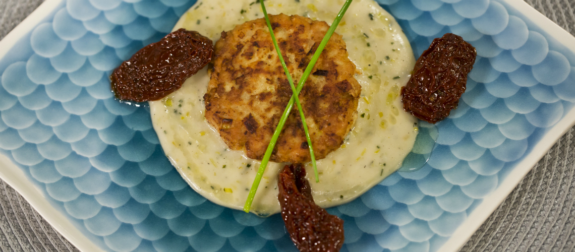 Tálaláskor a halhúsból formázott, pirított pogácsákat ebbe a mártásba helyezem és aszalt paradicsommal kínálom.