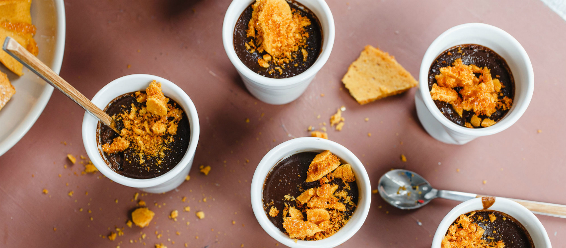 Levesszük a tűzről és a krémet kis edényekbe, üvegekbe, porceláncsészékbe töltjük 3/4-ig. Ezeket mély tepsibe állítjuk és az edénykék feléig forró vizet öntünk a tepsibe. 160 fokra előmelegített sütőben 30 perc alatt készre gőzöljük, nem kel, hogy teljesen megszilárduljon, az a jó, ha lágy marad a krém. A sütőből kivéve hagyjuk kihűlni, langyosan, vagy hűtőben 30 percet hűtve kínáljuk.