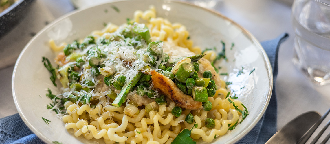 A serpenyőbe öntjük az alaplevet és a tejszínt, hozzáadjuk a mustárt, a citrom reszelt héját. Összeforraljuk, majd belereszeljük a parmezán felét. Citromlével ízesítjük. Visszatesszük a hűst és a zöldségeket a serpenyőbe, összeforgatjuk a mártással és kb. 5-7 percig főzzük.
