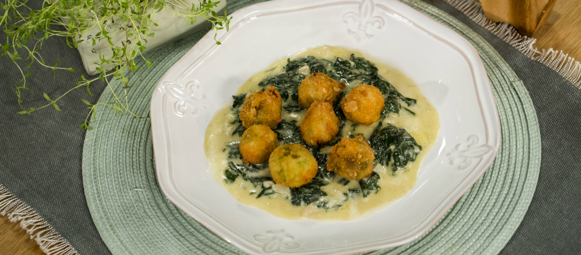 Kevés olajon szeletelt fokhagymát pirítunk, rátesszük a darabolt spenótot. Sózzuk, borsozzuk, majd tejszínnel és kevés tejföllel beforraljuk. A kelbimbót lisztbe, tojásba, morzsába forgatva bundázzuk és bő, forró olajban kisütjük.