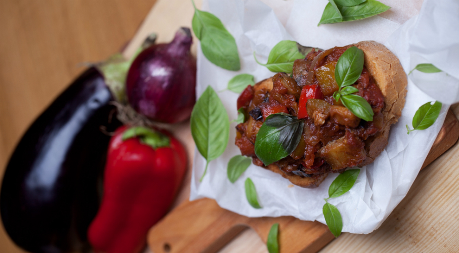 Egy nagy serpenyőben felhevítjük az olívaolajat, majd aranybarnára pirítjuk a kockára vágott padlizsánt. Sózzuk és borsozzuk. Kivesszük a serpenyőből és a felesleges zsiradékot leitatjuk. Ugyanabban a serpenyőben megsütjük a darabokra vágott paparikát, megszórjuk sóval sé borssal, majd hozzáadjuk a durvára aprított hagymát és fokhagymát. Végül megpirítjuk a kockára vágott cukkínit. Sózzuk, borsozzuk. Legvégül hozzáadjuk a paradicsomot és kicsit forraljuk. A serpenyőbe visszatesszük az összes zöldséget, összekeverjük, majd hozzáadjuk a paradicsompürét. Újra felforraljuk, és lefedjük. Kis lángon kb. 30 percig lassan főzzük. Időnként megkeverjük. Langyosan vagy hidegen tálaljuk.