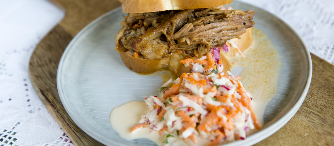 A fűszerekből készítsünk szárazpácot, szórjuk a húsra. Öntsünk alá kólát ás süssük 2,5 órán át. Kivesszük a csontokat, szétcincáljuk a húst. A zöldségeket vágjuk apróra: majonézzel ízesítjük, mint a káposztasalátát. Pirított briósón tálaljuk.