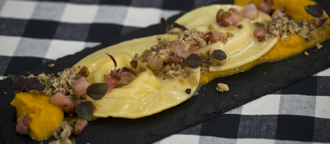 Sós vízben megfőzzük a raviolit, majd kevés vajon átforgatjuk. Tálalásnál alulra kerül a sütőtökkrém, rá a ravioli, és erre kerül a szalonna és a gesztenye.