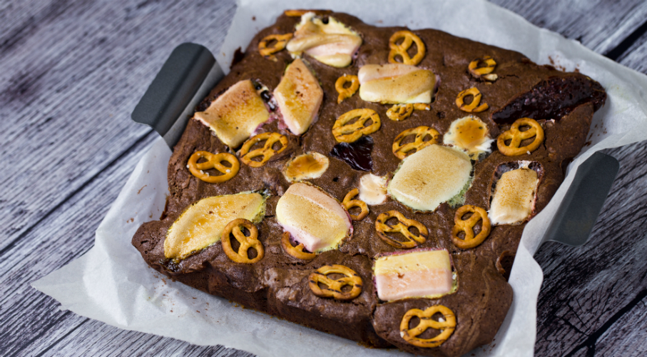 A formát sütőpapírral kibéleljük és előmelegítjük a sütőt 18o fokra. Az olvasztott vajat összekeverjük a porcukorral és az aprított perecekkel. Ezt a keveréket finoman lenyomkodjuk a forma aljába. A vajat a csokival folyamatos keverés mellett, egy kis edényben megolvasztjuk. Ha kész, tegyük félre hűlni. A tojásokat a cukorral és a vaníliás cukorral keverjük habosra egy kézimixerrel. Ehhez adjuk a langyosra hűlt csokit, majd a lisztet, az aprított mogyorót és a csipet sót. A masszát ráöntjük a pereces alapra, majd megszórjuk a cukorkákkal, perecekkel stb. 180 fokon 2o-25 percig sütjük, hogy a közepe még lágy legyen.