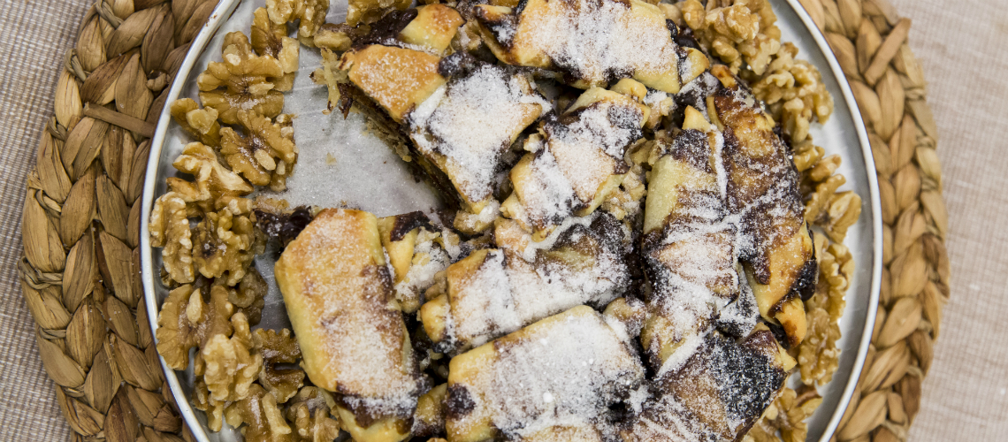 Egy nagy tortaformát alaposan kivajazunk és kilisztezünk, majd belepakoljuk a rugelach-okat úgy, hogy mindegyik köre szórunk a csokilencséből. Picit megnyomkodjuk, és visszatoljuk a sütőbe 20 percre. Miután teljesen kihűlt, kiborítjuk és felszeleteljük.