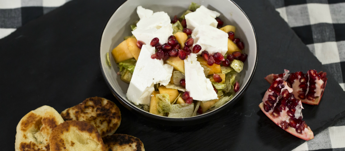 A sárgadinnyét, a jégsalátát felkockázom. Alaposan összeforgatom, borsozom, majd borecettel és tökmagolajjal locsolom. Tördelt feta sajtot és gránátalmát szórok a tetejére és a lepénnyel kínálom.