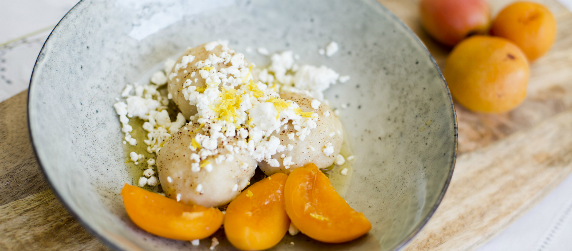 Egy nagy keverőtálban fakanállal vagy elektromos kézi keverővel kikeverjük a tészta hozzávalóit: először a krémes túrót, az olvasztott vajat, a tojás sárgáját, a cukrot, a reszelt citromhéjat és a sót. Hozzáadjuk az átszitált lisztet, majd kézzel közepesen kemény tésztát gyúrunk belőle. Bucit formázunk. Lisztezett gyúródeszkán egymás után két, 30x25cm-es téglalapot nyújtunk a tésztából. A téglalapból nyolc négyzetet vágunk. Mindegyik közepére egy-egy negyed sárgabarackot helyezünk. Négy csücskét szorosan összezárjuk, és gombócot formázunk. (Ebben az állapotában egyébként kiválóan fagyasztható, úgy hogy előbb egy tálcán egyesével fagyasztjuk a gombócokat, csak aztán tesszük zacskóba, különben összeállna egy nagy tömbbé.) Egy nagy lábasban, lobogó, sós forró vízben kb. 15 perc alatt kifőzzük a gombócokat -akkor készültek el, amikor feljönnek a víz tetejére. Miközben fő a gombóc, elkészítjük a barnított vajat: közepes méretű lábasban felolvasztjuk, és addig pirítjuk, kb. 7-8 percig, amíg mély, aranyszínű, dió illatú lesz, az edény aljára ereszkedett pici darabkák pedig barna színűre karamellizálódnak. Azonnal átöntjük egy kis tálkába. (Ne álljon sokáig, mert elkezd visszadermedni!) Tálaláskor a gombócokat meglocsoljuk a barnított vajjal, és rámorzsoljuk a túrót. Opcionálisan hinthetünk rá kevés porcukrot, szerintem nem szükséges.