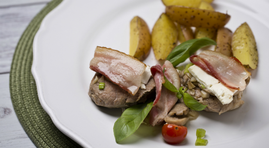 A sertés szűzérméket kiklopfoljuk, sózzuk, borsozzuk és egy serpenyőben olajon megsütjük. Ha a szűzérmék kieresztik a levüket, jobb leönteni a vizet, hogy csak az olajon süljön. Amikor a szűzérmék megsültek, egy sütőtálba tesszük őket. A serpenyőben maradt szaftra szórjuk a feldarabolt gombát, sózzuk, borsozzuk, hozzáadunk egy kevés szárított fokhagymát, kakukkfüvet, Worchester szószt, szójaszószt és felöntjük vízzel. Amikor a gomba kissé megpuhult, kiszedjük és a tálban lévő húsra simítjuk. A tetejére szórjuk a felaprított újhagymát, sajtszeleteket, és szalonna szeleteket. Ráöntjük a szaftot és kb. 20 percig 200 °C fokos sütőben sütjük. A steak burgonyához a krumplit nem hámozzuk, csak megmossuk és gerezdekre vágjuk. Kerámia sütőedénybe tesszük (vagy tepsire), meglocsoljuk olajjal, megszórjuk steak fűszerkeverékkel, vagy grill fűszerkeverékkel. 200 °C fokon sütjük, közben átkeverjük, hogy minden oldalról szépen megpiruljon.