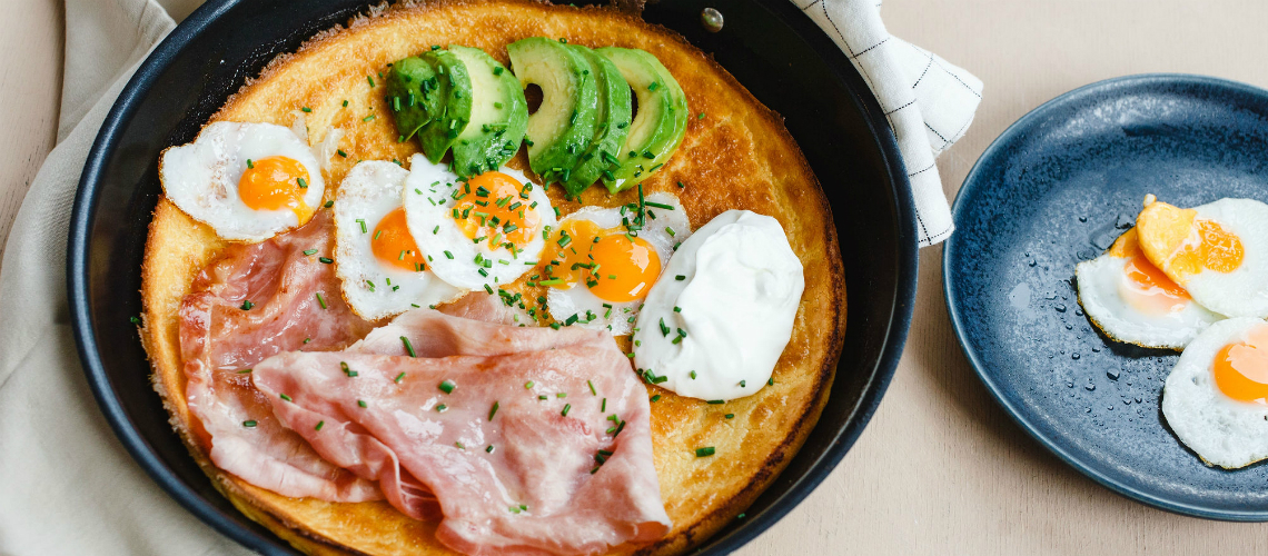 A tojást robotgép segítségével kissé felverjük, majd hozzáadjuk a tejet és a tejszínt. A lisztet beleszitáljuk, sózzuk és az egészet összekeverjük. A forró serpenyőt kivesszük a sütőből, beleöntjük a tésztát, belereszeljük a sajtot, rátesszük a sonkát és beleütjük a tojásokat, majd az előmelegített sütőbe tesszük és 18-20 percig sütjük. A végén avokádó szeletekkel tálaljuk.
