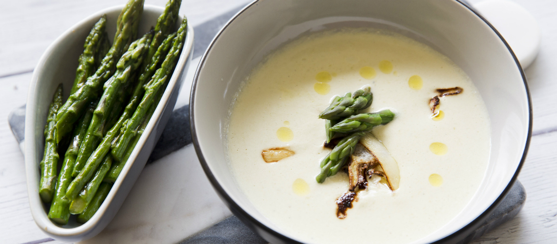 A finomra vágott hagymát vajon és olívaolajon megpirítjuk, a petrezselyem egy részét felvágjuk chipsznek, a többit hagymán sütjük meg. Adjunk hozzá kakukkfüvet és a megtisztított spárga végeket, öntsük fel alaplével és fűszerezzük, majd főzzük.