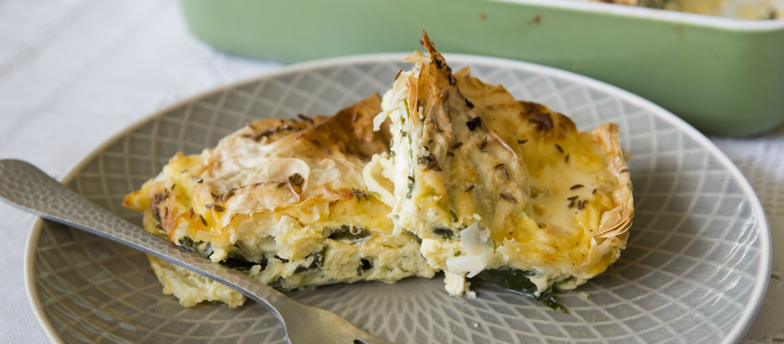 A sütőt előmelegítjük 180C fokra. Egy serpenyőben felhevítjük az olívaolajat, majd üvegesre dinszteljük rajta a felkarikázott újhagymát. Rádobjuk az előkészített spenótot, és addig főzzük, amíg összeesik. Kivajazunk egy 28×20 cm-es tepsit. A réteslapokat a tepsivel azonos méretű téglalapokra vágjuk, négy lapból álljon egy réteg. A tejet összekeverjük a joghurttal és a tojással, sózzuk, borsozzuk. A réteslapokat megkenjük olvasztott vajjal, (közben a többi lapot terítsük le nedves konyharuhával, hogy ne száradjon ki), és tepsibe rakjuk az első réteget: a lapot meglocsoljuk a tojásos-tejes keverékkel, majd elosztjuk rajta hagymás spenót felét Úgy gazdálkodjunk, hogy összesen három rétegünk lesz, tehát a tölteléket kétfelé, a tejes-joghurtos keveréket háromfelé osszuk. Ismét vajjal megkent réteslap következik, tejes folyadék, spenót, majd erre a rétegre morzsoljuk a fetasajtot. Legfelül ismét réteslap jön. A tetejét meglocsoljuk a maradék tejjel, és meghintjük szezámmaggal, vagy fekete hagymamaggal. 35-40 perc alatt aranyszínűre sütjük. Langyosan, felkockázva tálaljuk.