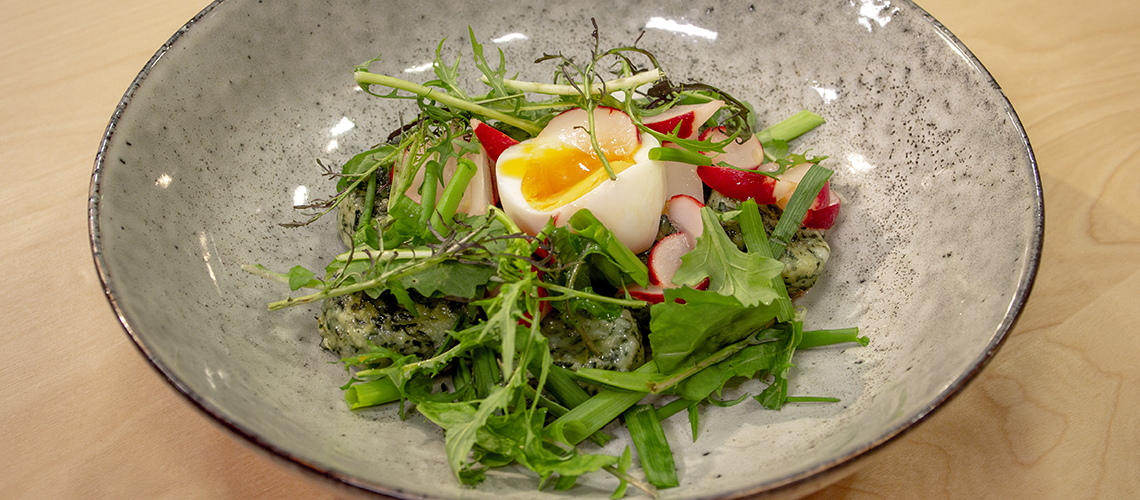 Tálaláskor tányérokra szedjük a tésztát és az elfelezett tojásokat, majd a retket összekeverjük a zöldfűszerekkel, ízesítjük a hozzávalókkal, és ezt a salátát is ízlésesen elrendezzük a tányéron.