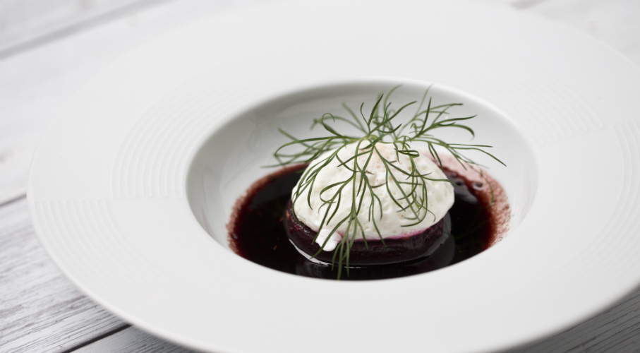 A pucolt, főtt céklát egyforma karikákra vágjuk, majd kevés olajban zúzott friss gyömbérrel együtt alaposan megpirítjuk. Sózzuk, borsozzuk. Félretesszük egy tányérra, majd a serpenyőben vörösbort forralunk, amit hagyunk besűrűsödni és kevés mézzel édesítünk. Buggyantott tojást készítünk úgy, hogy sós, ecetes, forrásban lévő vízbe egy merőkanalat helyezünk, melybe beleütünk egy egész tojást és 3,5 percig főzzük. Tálaláskor a céklára öntjük a vörösbormártást, rátesszük a tojást és friss zöldfűszerrel szórjuk.