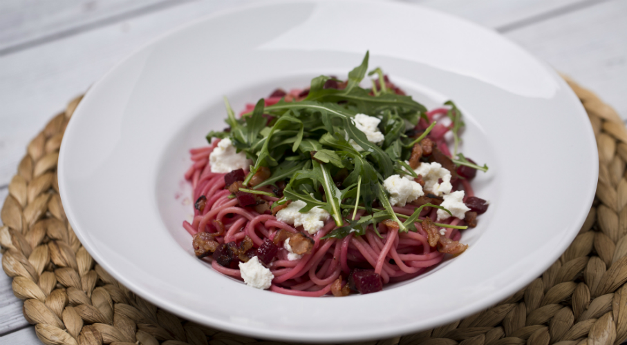 A sült cékla nagy részét feldaraboljuk és húsalaplével, esetleg kevés vízzel leturmixoljuk. Sózzuk, borsozzuk. A megfőzött spagettivel összeforgatjuk a mártást és tálaláskor ricottát, friss rukkolát, pirított bacont és a maradék céklát helyezzük a tetejére.